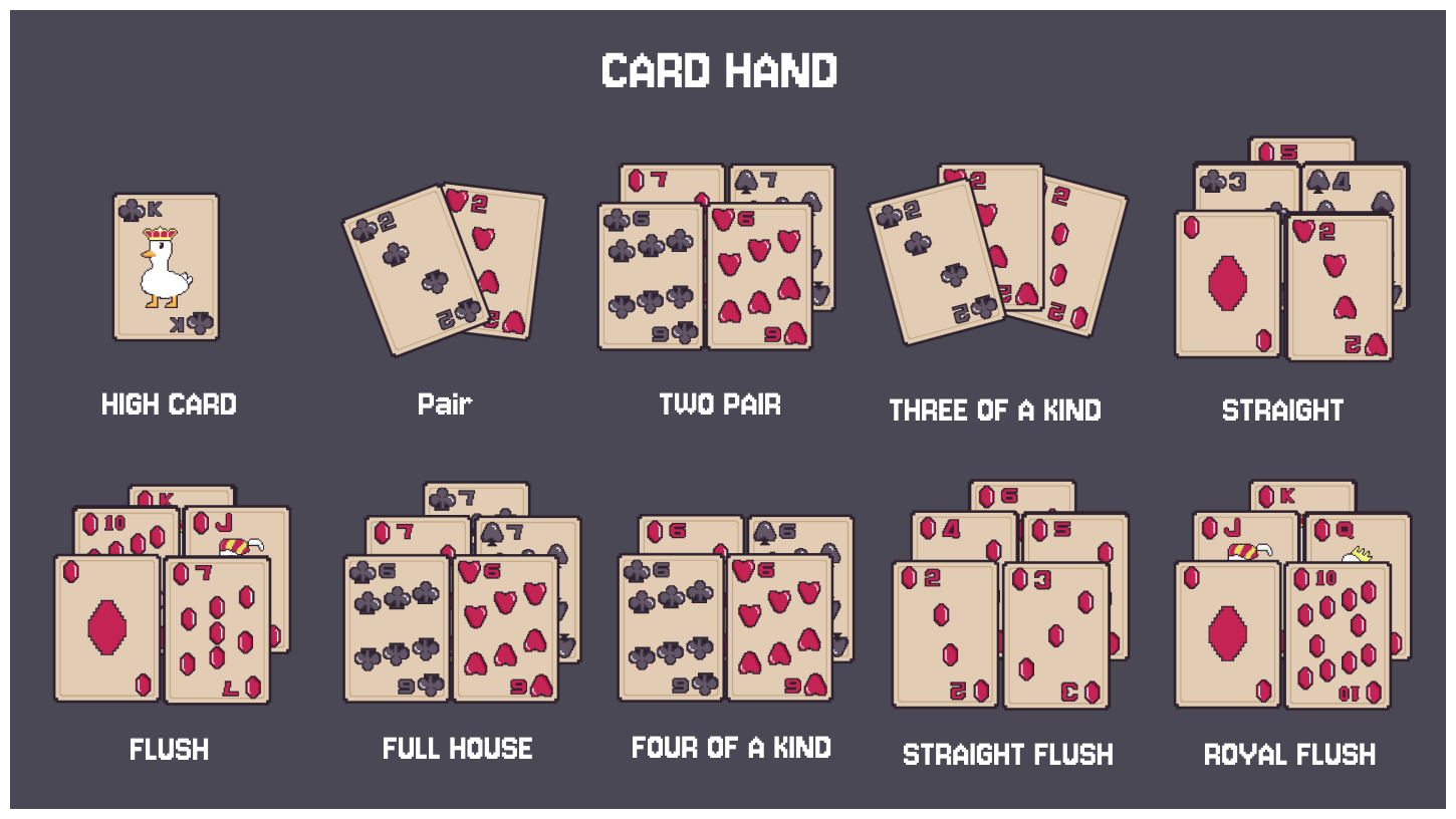 - Use hand combinations for utility. (Pair, straight, flush. etc)